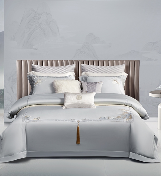 錦繡緞,產(chǎn)品繡花仿佛一副畫卷引入眼簾,抽象的山水在縹緲的云霧中繚繞,巍峨的宮殿錯落在山水之間,盡顯悠然意境。產(chǎn)品繡花精致細膩,線色與面料色彩搭配寧靜雅致,被面中心點綴精致的流蘇穗來提高產(chǎn)品的格調(diào),山水、云霧與宮殿相映成趣,構(gòu)成了滿含中式韻味、意境悠遠的場景,讓人身臨其境