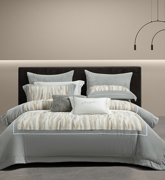 在絨面提花設(shè)計上,運用不同深淺的柔和色調(diào)打造出如同沙丘般此起彼伏的紋理,為臥室營造出溫馨且靜謐的氛圍。色布上的三框毛巾繡,增添了床品的層次感與趣味性。