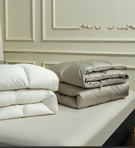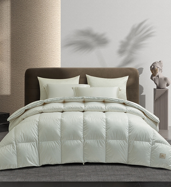 面料采用高支高密防羽提花面料,經(jīng)向采用全棉紗線,通過織造主要呈現(xiàn)在表面,更貼合被套,手感更柔軟,提花花型簡約大氣;內(nèi)部填充加拿大進(jìn)口白鵝絨,擷選加拿大北緯68°以上高寒地區(qū)成熟白鵝,胸和腋下額柔軟的30g絨毛,經(jīng)過多次水洗,消毒,烘干,不經(jīng)過后期漂白,保證始終如一的自然純凈;被子內(nèi)部采用3D立襯航空倉設(shè)計,使得羽絨更蓬松保暖;被頭采用專利壓風(fēng)設(shè)計,上層填充白鵝絨,保暖護(hù)肩;下層填充桑蠶長絲,更壓風(fēng)貼身。被子四周12根扣袢設(shè)計,區(qū)別于常規(guī)被角帶設(shè)計,使用起來更有效貼合被套的同時,還能隨意切換組合搭配,起到一被多用的效果